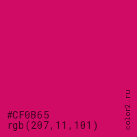 Цвет #CF0B65 в цветовой модели RGB обозначается тремя октетами (207, 11, 101) в десятичном формате и #CF0B65 в шестнадцатиричном (hex) формате, которые являются интенсивностью красного 207 (hex CF), интенсивность зелёного 11 (hex 0B) и интенсивность синего 101 (hex 65).