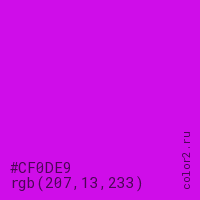 Цвет #CF0DE9 в цветовой модели RGB обозначается тремя октетами (207, 13, 233) в десятичном формате и #CF0DE9 в шестнадцатиричном (hex) формате, которые являются интенсивностью красного 207 (hex CF), интенсивность зелёного 13 (hex 0D) и интенсивность синего 233 (hex E9).