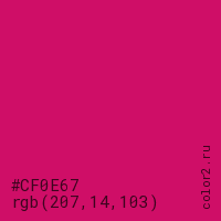 Цвет #CF0E67 в цветовой модели RGB обозначается тремя октетами (207, 14, 103) в десятичном формате и #CF0E67 в шестнадцатиричном (hex) формате, которые являются интенсивностью красного 207 (hex CF), интенсивность зелёного 14 (hex 0E) и интенсивность синего 103 (hex 67).