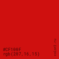 Цвет #CF100F в цветовой модели RGB обозначается тремя октетами (207, 16, 15) в десятичном формате и #CF100F в шестнадцатиричном (hex) формате, которые являются интенсивностью красного 207 (hex CF), интенсивность зелёного 16 (hex 10) и интенсивность синего 15 (hex 0F).