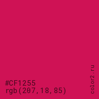 Цвет #CF1255 в цветовой модели RGB обозначается тремя октетами (207, 18, 85) в десятичном формате и #CF1255 в шестнадцатиричном (hex) формате, которые являются интенсивностью красного 207 (hex CF), интенсивность зелёного 18 (hex 12) и интенсивность синего 85 (hex 55).