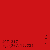 Цвет #CF1317 в цветовой модели RGB обозначается тремя октетами (207, 19, 23) в десятичном формате и #CF1317 в шестнадцатиричном (hex) формате, которые являются интенсивностью красного 207 (hex CF), интенсивность зелёного 19 (hex 13) и интенсивность синего 23 (hex 17).