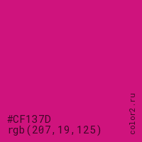 Цвет #CF137D в цветовой модели RGB обозначается тремя октетами (207, 19, 125) в десятичном формате и #CF137D в шестнадцатиричном (hex) формате, которые являются интенсивностью красного 207 (hex CF), интенсивность зелёного 19 (hex 13) и интенсивность синего 125 (hex 7D).