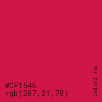 Цвет #CF1546 в цветовой модели RGB обозначается тремя октетами (207, 21, 70) в десятичном формате и #CF1546 в шестнадцатиричном (hex) формате, которые являются интенсивностью красного 207 (hex CF), интенсивность зелёного 21 (hex 15) и интенсивность синего 70 (hex 46).
