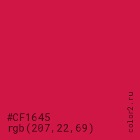 Цвет #CF1645 в цветовой модели RGB обозначается тремя октетами (207, 22, 69) в десятичном формате и #CF1645 в шестнадцатиричном (hex) формате, которые являются интенсивностью красного 207 (hex CF), интенсивность зелёного 22 (hex 16) и интенсивность синего 69 (hex 45).