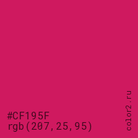 Цвет #CF195F в цветовой модели RGB обозначается тремя октетами (207, 25, 95) в десятичном формате и #CF195F в шестнадцатиричном (hex) формате, которые являются интенсивностью красного 207 (hex CF), интенсивность зелёного 25 (hex 19) и интенсивность синего 95 (hex 5F).