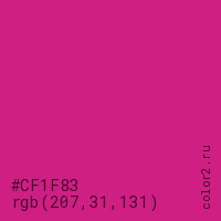 Цвет #CF1F83 в цветовой модели RGB обозначается тремя октетами (207, 31, 131) в десятичном формате и #CF1F83 в шестнадцатиричном (hex) формате, которые являются интенсивностью красного 207 (hex CF), интенсивность зелёного 31 (hex 1F) и интенсивность синего 131 (hex 83).