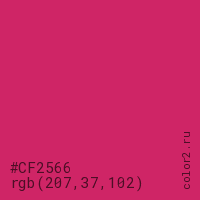 Цвет #CF2566 в цветовой модели RGB обозначается тремя октетами (207, 37, 102) в десятичном формате и #CF2566 в шестнадцатиричном (hex) формате, которые являются интенсивностью красного 207 (hex CF), интенсивность зелёного 37 (hex 25) и интенсивность синего 102 (hex 66).