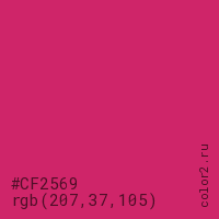 Цвет #CF2569 в цветовой модели RGB обозначается тремя октетами (207, 37, 105) в десятичном формате и #CF2569 в шестнадцатиричном (hex) формате, которые являются интенсивностью красного 207 (hex CF), интенсивность зелёного 37 (hex 25) и интенсивность синего 105 (hex 69).