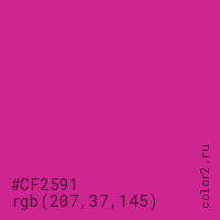Цвет #CF2591 в цветовой модели RGB обозначается тремя октетами (207, 37, 145) в десятичном формате и #CF2591 в шестнадцатиричном (hex) формате, которые являются интенсивностью красного 207 (hex CF), интенсивность зелёного 37 (hex 25) и интенсивность синего 145 (hex 91).
