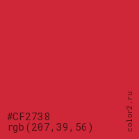 Цвет #CF2738 в цветовой модели RGB обозначается тремя октетами (207, 39, 56) в десятичном формате и #CF2738 в шестнадцатиричном (hex) формате, которые являются интенсивностью красного 207 (hex CF), интенсивность зелёного 39 (hex 27) и интенсивность синего 56 (hex 38).