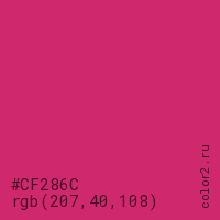 Цвет #CF286C в цветовой модели RGB обозначается тремя октетами (207, 40, 108) в десятичном формате и #CF286C в шестнадцатиричном (hex) формате, которые являются интенсивностью красного 207 (hex CF), интенсивность зелёного 40 (hex 28) и интенсивность синего 108 (hex 6C).