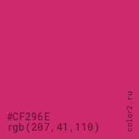 Цвет #CF296E в цветовой модели RGB обозначается тремя октетами (207, 41, 110) в десятичном формате и #CF296E в шестнадцатиричном (hex) формате, которые являются интенсивностью красного 207 (hex CF), интенсивность зелёного 41 (hex 29) и интенсивность синего 110 (hex 6E).