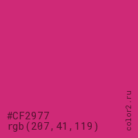 Цвет #CF2977 в цветовой модели RGB обозначается тремя октетами (207, 41, 119) в десятичном формате и #CF2977 в шестнадцатиричном (hex) формате, которые являются интенсивностью красного 207 (hex CF), интенсивность зелёного 41 (hex 29) и интенсивность синего 119 (hex 77).