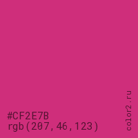 Цвет #CF2E7B в цветовой модели RGB обозначается тремя октетами (207, 46, 123) в десятичном формате и #CF2E7B в шестнадцатиричном (hex) формате, которые являются интенсивностью красного 207 (hex CF), интенсивность зелёного 46 (hex 2E) и интенсивность синего 123 (hex 7B).