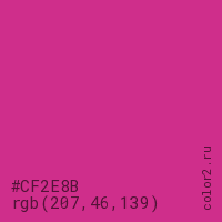 Цвет #CF2E8B в цветовой модели RGB обозначается тремя октетами (207, 46, 139) в десятичном формате и #CF2E8B в шестнадцатиричном (hex) формате, которые являются интенсивностью красного 207 (hex CF), интенсивность зелёного 46 (hex 2E) и интенсивность синего 139 (hex 8B).