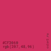 Цвет #CF3060 в цветовой модели RGB обозначается тремя октетами (207, 48, 96) в десятичном формате и #CF3060 в шестнадцатиричном (hex) формате, которые являются интенсивностью красного 207 (hex CF), интенсивность зелёного 48 (hex 30) и интенсивность синего 96 (hex 60).