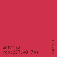 Цвет #CF314A в цветовой модели RGB обозначается тремя октетами (207, 49, 74) в десятичном формате и #CF314A в шестнадцатиричном (hex) формате, которые являются интенсивностью красного 207 (hex CF), интенсивность зелёного 49 (hex 31) и интенсивность синего 74 (hex 4A).