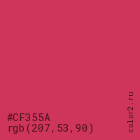 Цвет #CF355A в цветовой модели RGB обозначается тремя октетами (207, 53, 90) в десятичном формате и #CF355A в шестнадцатиричном (hex) формате, которые являются интенсивностью красного 207 (hex CF), интенсивность зелёного 53 (hex 35) и интенсивность синего 90 (hex 5A).