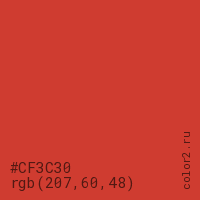 Цвет #CF3C30 в цветовой модели RGB обозначается тремя октетами (207, 60, 48) в десятичном формате и #CF3C30 в шестнадцатиричном (hex) формате, которые являются интенсивностью красного 207 (hex CF), интенсивность зелёного 60 (hex 3C) и интенсивность синего 48 (hex 30).
