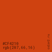 Цвет #CF4210 в цветовой модели RGB обозначается тремя октетами (207, 66, 16) в десятичном формате и #CF4210 в шестнадцатиричном (hex) формате, которые являются интенсивностью красного 207 (hex CF), интенсивность зелёного 66 (hex 42) и интенсивность синего 16 (hex 10).