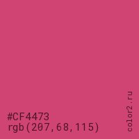 Цвет #CF4473 в цветовой модели RGB обозначается тремя октетами (207, 68, 115) в десятичном формате и #CF4473 в шестнадцатиричном (hex) формате, которые являются интенсивностью красного 207 (hex CF), интенсивность зелёного 68 (hex 44) и интенсивность синего 115 (hex 73).