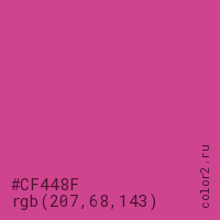 Цвет #CF448F в цветовой модели RGB обозначается тремя октетами (207, 68, 143) в десятичном формате и #CF448F в шестнадцатиричном (hex) формате, которые являются интенсивностью красного 207 (hex CF), интенсивность зелёного 68 (hex 44) и интенсивность синего 143 (hex 8F).