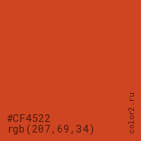 Цвет #CF4522 в цветовой модели RGB обозначается тремя октетами (207, 69, 34) в десятичном формате и #CF4522 в шестнадцатиричном (hex) формате, которые являются интенсивностью красного 207 (hex CF), интенсивность зелёного 69 (hex 45) и интенсивность синего 34 (hex 22).