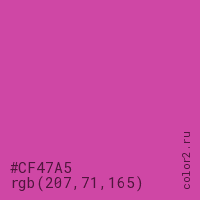 Цвет #CF47A5 в цветовой модели RGB обозначается тремя октетами (207, 71, 165) в десятичном формате и #CF47A5 в шестнадцатиричном (hex) формате, которые являются интенсивностью красного 207 (hex CF), интенсивность зелёного 71 (hex 47) и интенсивность синего 165 (hex A5).