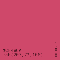 Цвет #CF486A в цветовой модели RGB обозначается тремя октетами (207, 72, 106) в десятичном формате и #CF486A в шестнадцатиричном (hex) формате, которые являются интенсивностью красного 207 (hex CF), интенсивность зелёного 72 (hex 48) и интенсивность синего 106 (hex 6A).