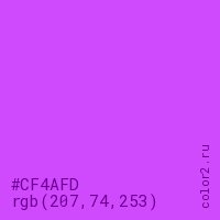 Цвет #CF4AFD в цветовой модели RGB обозначается тремя октетами (207, 74, 253) в десятичном формате и #CF4AFD в шестнадцатиричном (hex) формате, которые являются интенсивностью красного 207 (hex CF), интенсивность зелёного 74 (hex 4A) и интенсивность синего 253 (hex FD).