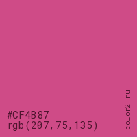 Цвет #CF4B87 в цветовой модели RGB обозначается тремя октетами (207, 75, 135) в десятичном формате и #CF4B87 в шестнадцатиричном (hex) формате, которые являются интенсивностью красного 207 (hex CF), интенсивность зелёного 75 (hex 4B) и интенсивность синего 135 (hex 87).