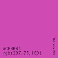 Цвет #CF4BB4 в цветовой модели RGB обозначается тремя октетами (207, 75, 180) в десятичном формате и #CF4BB4 в шестнадцатиричном (hex) формате, которые являются интенсивностью красного 207 (hex CF), интенсивность зелёного 75 (hex 4B) и интенсивность синего 180 (hex B4).
