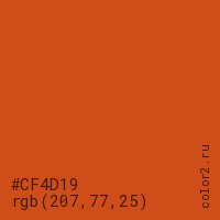 Цвет #CF4D19 в цветовой модели RGB обозначается тремя октетами (207, 77, 25) в десятичном формате и #CF4D19 в шестнадцатиричном (hex) формате, которые являются интенсивностью красного 207 (hex CF), интенсивность зелёного 77 (hex 4D) и интенсивность синего 25 (hex 19).