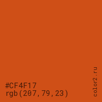 Цвет #CF4F17 в цветовой модели RGB обозначается тремя октетами (207, 79, 23) в десятичном формате и #CF4F17 в шестнадцатиричном (hex) формате, которые являются интенсивностью красного 207 (hex CF), интенсивность зелёного 79 (hex 4F) и интенсивность синего 23 (hex 17).