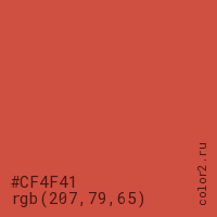 Цвет #CF4F41 в цветовой модели RGB обозначается тремя октетами (207, 79, 65) в десятичном формате и #CF4F41 в шестнадцатиричном (hex) формате, которые являются интенсивностью красного 207 (hex CF), интенсивность зелёного 79 (hex 4F) и интенсивность синего 65 (hex 41).