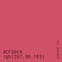 Цвет #CF5069 в цветовой модели RGB обозначается тремя октетами (207, 80, 105) в десятичном формате и #CF5069 в шестнадцатиричном (hex) формате, которые являются интенсивностью красного 207 (hex CF), интенсивность зелёного 80 (hex 50) и интенсивность синего 105 (hex 69).
