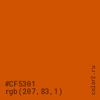 Цвет #CF5301 в цветовой модели RGB обозначается тремя октетами (207, 83, 1) в десятичном формате и #CF5301 в шестнадцатиричном (hex) формате, которые являются интенсивностью красного 207 (hex CF), интенсивность зелёного 83 (hex 53) и интенсивность синего 1 (hex 01).