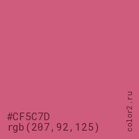 Цвет #CF5C7D в цветовой модели RGB обозначается тремя октетами (207, 92, 125) в десятичном формате и #CF5C7D в шестнадцатиричном (hex) формате, которые являются интенсивностью красного 207 (hex CF), интенсивность зелёного 92 (hex 5C) и интенсивность синего 125 (hex 7D).