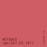 Цвет #CF5D65 в цветовой модели RGB обозначается тремя октетами (207, 93, 101) в десятичном формате и #CF5D65 в шестнадцатиричном (hex) формате, которые являются интенсивностью красного 207 (hex CF), интенсивность зелёного 93 (hex 5D) и интенсивность синего 101 (hex 65).