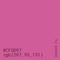 Цвет #CF5D97 в цветовой модели RGB обозначается тремя октетами (207, 93, 151) в десятичном формате и #CF5D97 в шестнадцатиричном (hex) формате, которые являются интенсивностью красного 207 (hex CF), интенсивность зелёного 93 (hex 5D) и интенсивность синего 151 (hex 97).