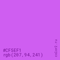Цвет #CF5EF1 в цветовой модели RGB обозначается тремя октетами (207, 94, 241) в десятичном формате и #CF5EF1 в шестнадцатиричном (hex) формате, которые являются интенсивностью красного 207 (hex CF), интенсивность зелёного 94 (hex 5E) и интенсивность синего 241 (hex F1).