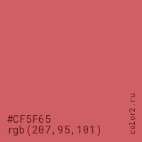 Цвет #CF5F65 в цветовой модели RGB обозначается тремя октетами (207, 95, 101) в десятичном формате и #CF5F65 в шестнадцатиричном (hex) формате, которые являются интенсивностью красного 207 (hex CF), интенсивность зелёного 95 (hex 5F) и интенсивность синего 101 (hex 65).