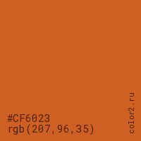 Цвет #CF6023 в цветовой модели RGB обозначается тремя октетами (207, 96, 35) в десятичном формате и #CF6023 в шестнадцатиричном (hex) формате, которые являются интенсивностью красного 207 (hex CF), интенсивность зелёного 96 (hex 60) и интенсивность синего 35 (hex 23).