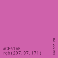 Цвет #CF61AB в цветовой модели RGB обозначается тремя октетами (207, 97, 171) в десятичном формате и #CF61AB в шестнадцатиричном (hex) формате, которые являются интенсивностью красного 207 (hex CF), интенсивность зелёного 97 (hex 61) и интенсивность синего 171 (hex AB).