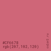 Цвет #CF6678 в цветовой модели RGB обозначается тремя октетами (207, 102, 120) в десятичном формате и #CF6678 в шестнадцатиричном (hex) формате, которые являются интенсивностью красного 207 (hex CF), интенсивность зелёного 102 (hex 66) и интенсивность синего 120 (hex 78).