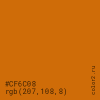 Цвет #CF6C08 в цветовой модели RGB обозначается тремя октетами (207, 108, 8) в десятичном формате и #CF6C08 в шестнадцатиричном (hex) формате, которые являются интенсивностью красного 207 (hex CF), интенсивность зелёного 108 (hex 6C) и интенсивность синего 8 (hex 08).