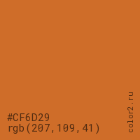 Цвет #CF6D29 в цветовой модели RGB обозначается тремя октетами (207, 109, 41) в десятичном формате и #CF6D29 в шестнадцатиричном (hex) формате, которые являются интенсивностью красного 207 (hex CF), интенсивность зелёного 109 (hex 6D) и интенсивность синего 41 (hex 29).