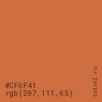 Цвет #CF6F41 в цветовой модели RGB обозначается тремя октетами (207, 111, 65) в десятичном формате и #CF6F41 в шестнадцатиричном (hex) формате, которые являются интенсивностью красного 207 (hex CF), интенсивность зелёного 111 (hex 6F) и интенсивность синего 65 (hex 41).