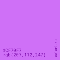 Цвет #CF70F7 в цветовой модели RGB обозначается тремя октетами (207, 112, 247) в десятичном формате и #CF70F7 в шестнадцатиричном (hex) формате, которые являются интенсивностью красного 207 (hex CF), интенсивность зелёного 112 (hex 70) и интенсивность синего 247 (hex F7).